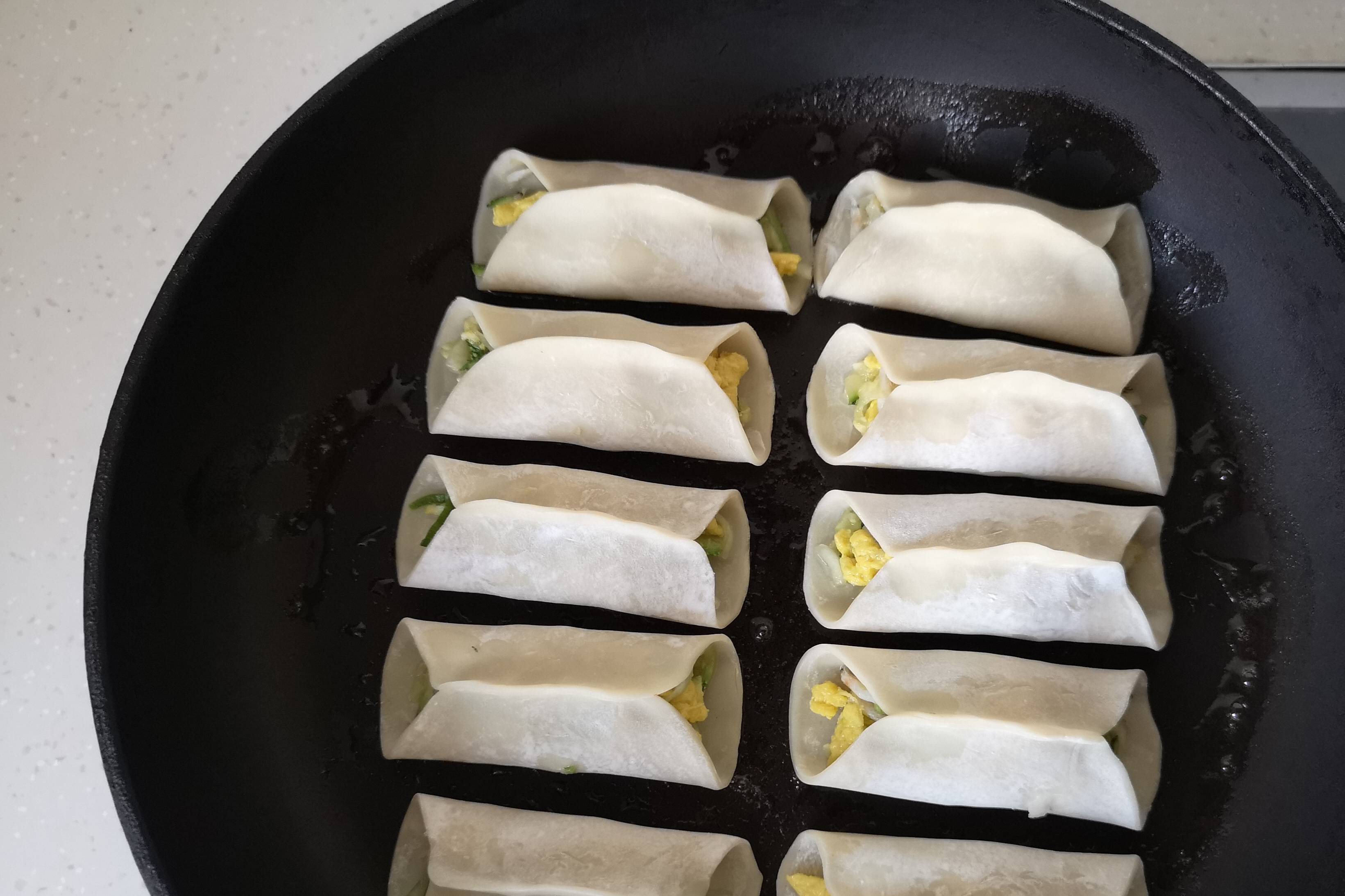 【西葫蘆雞蛋鍋貼】準備食材:西葫蘆一個,雞蛋兩個,蝦皮一把,鹽適量,大蔥一根,蠔油一勺,花生油適量,餃子皮適量