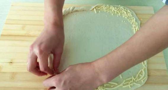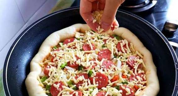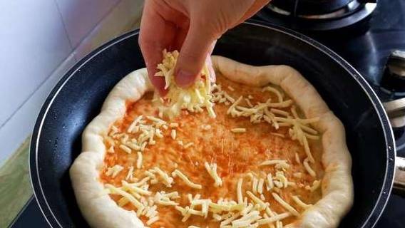 披薩上面最常見的食材就是火腿,洋蔥和青椒瞭,把這些都切成丁,面團發酵好的時候,先把裡面的氣都揉出來,然後把它搟成薄餅,在餅的周圍撒上一圈的芝士,然後把邊卷起來,把上面的芝士都包裹進去,找一個叉子在面餅上叉一些小孔,這個時候就可以在,油鍋裡面刷一層油,然後把面餅放進去,在底部刷一層番茄醬,然後撒一層芝士,建議芝士多一些。