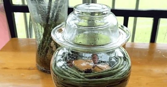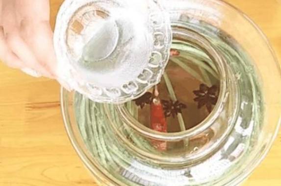 重要的第五步.輕輕地將之前放涼的泡菜水,然後,倒入幾杯白酒,封好蓋子,在這裡有一個小竅門,就是在壇邊倒一點清水將他密封,後來的工序不可少,這是味道是否鮮美的關鍵,註意過幾天要少許水繼續密封,不要忘瞭將他放在陰涼通風處,一般放置五六天就可以開蓋食用瞭。