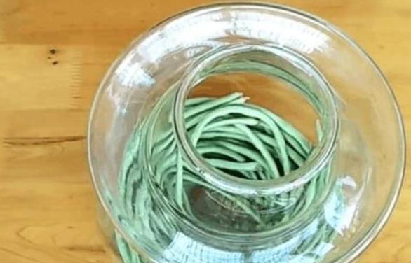 第四步.要備好一個沒有水潔凈的盤子,一定要註意幹凈衛生。然後將之前晾的半幹的豆角輕輕地存入罐裡,大傢一定要註意一件事,那就是泡豆角的這一連續的過程中切忌蘸油,這是非常重要的,會直接影響到豆角的口感。否則會導致豆角生花變軟,這樣一來,就前功盡棄瞭,口感會大打折扣。