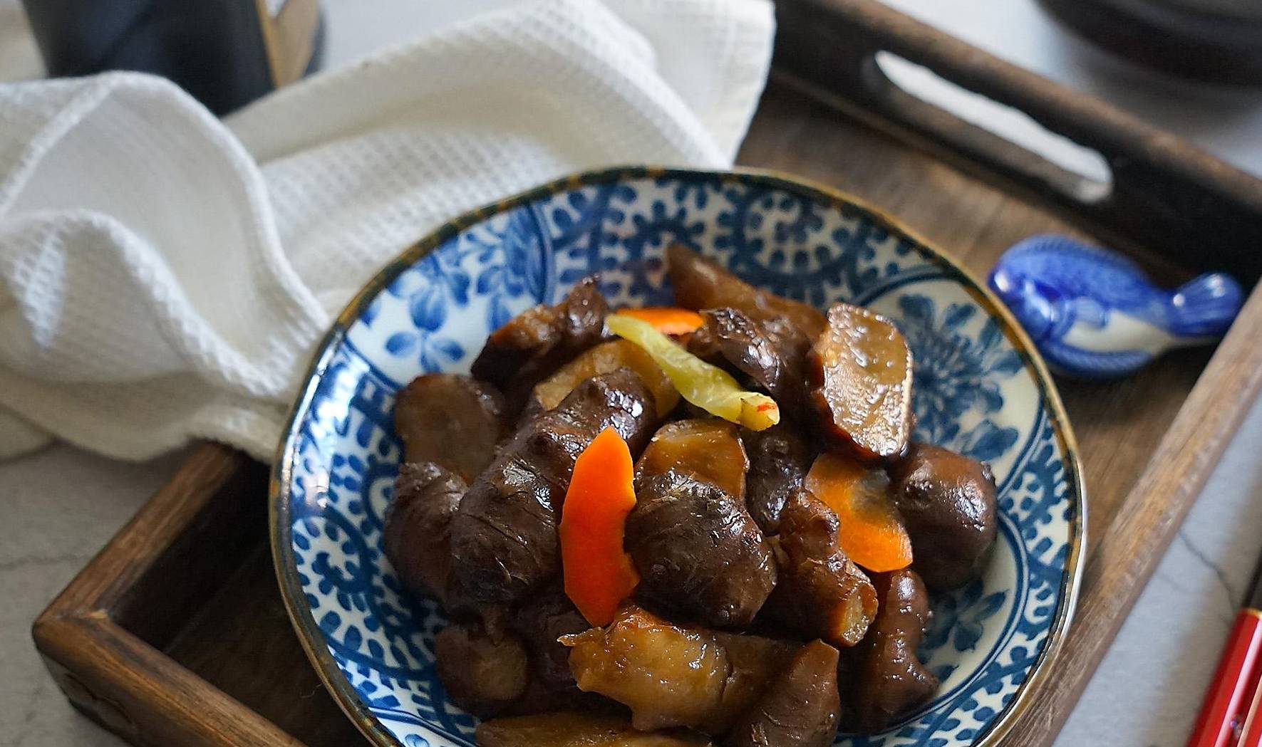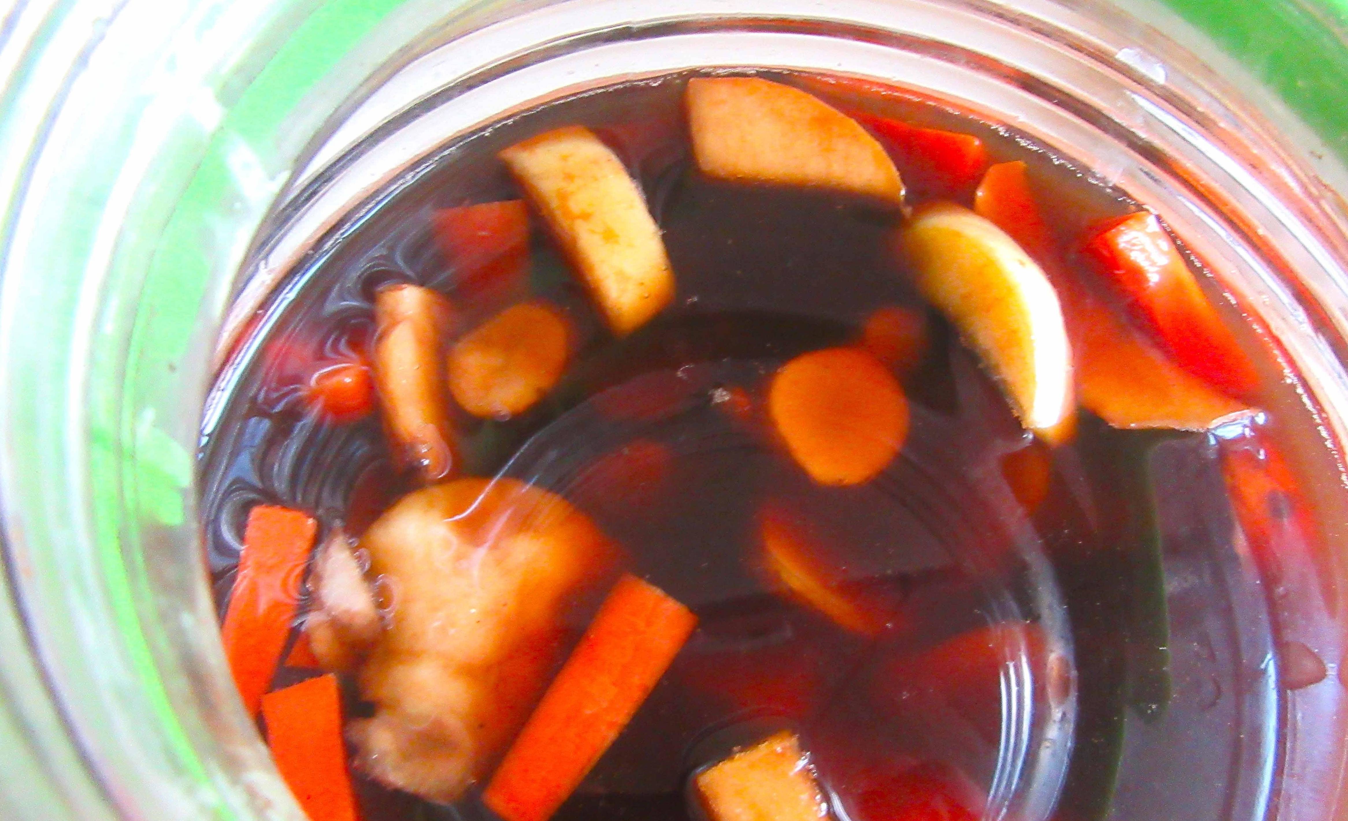 【食材】地薑4斤、胡蘿卜2根、生抽半瓶、老抽半碗、鹽適量,白糖4大勺、泡椒少許、醋1勺。
