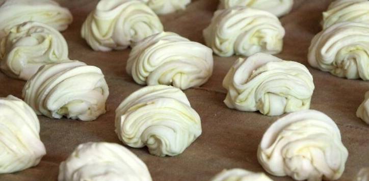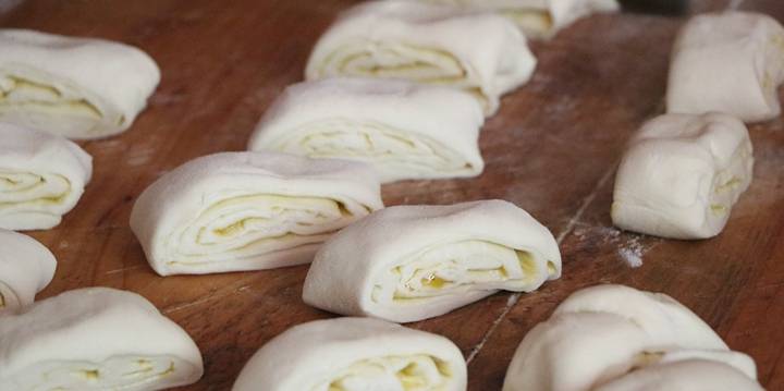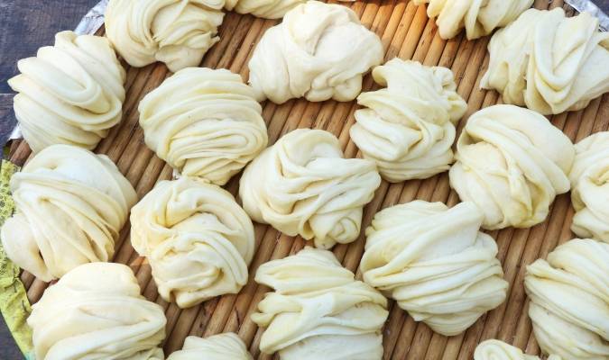 5、做成花卷的樣子,擺放在蒸籠屜上;