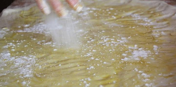 3、揉好的面團搟成薄片,撒適量的食用鹽、植物油塗均勻;最後撒適量的幹粉;