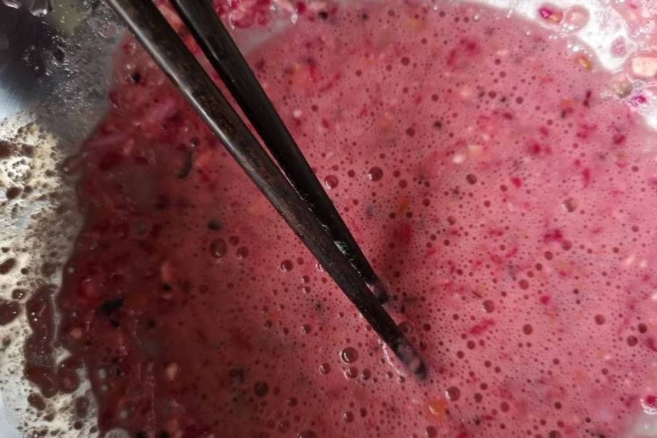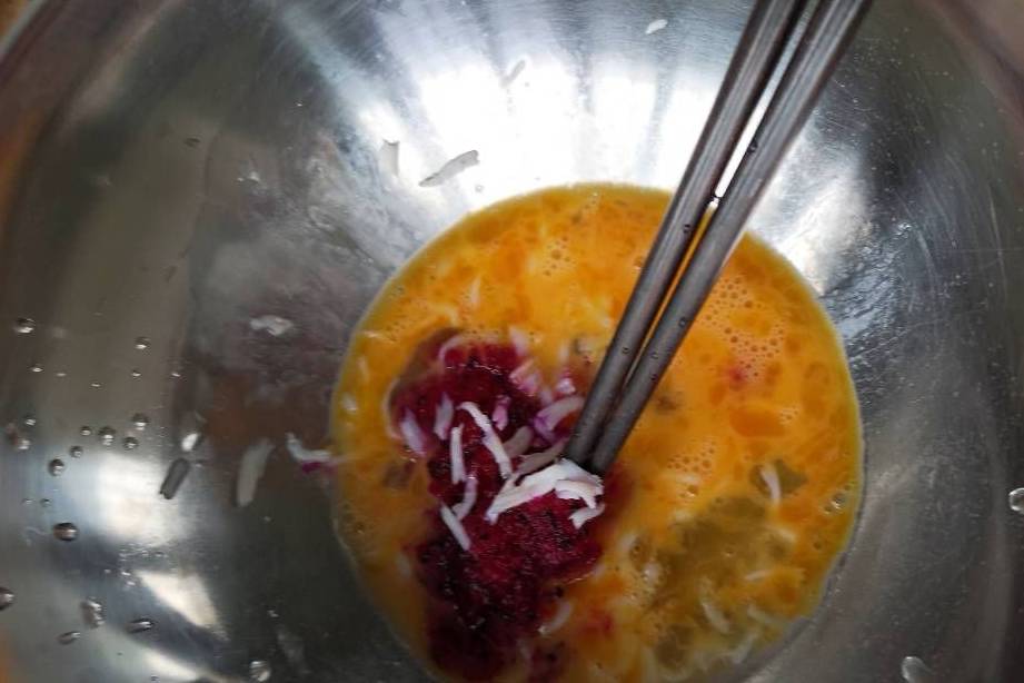 4、將銀魚撕碎,和火龍果一起加入打散的蛋中,攪拌均勻