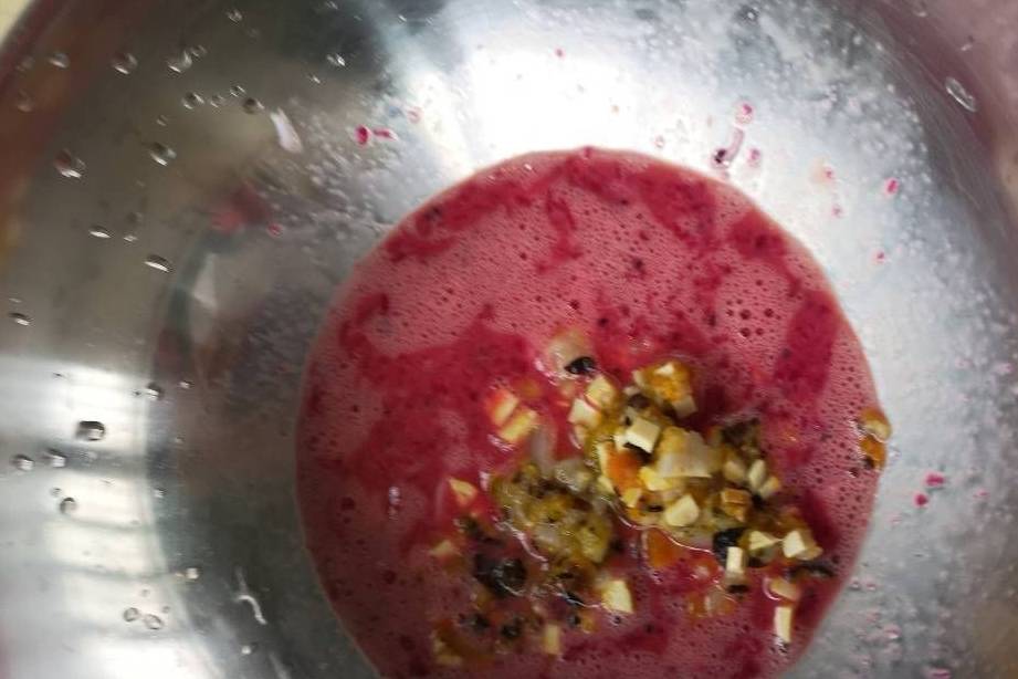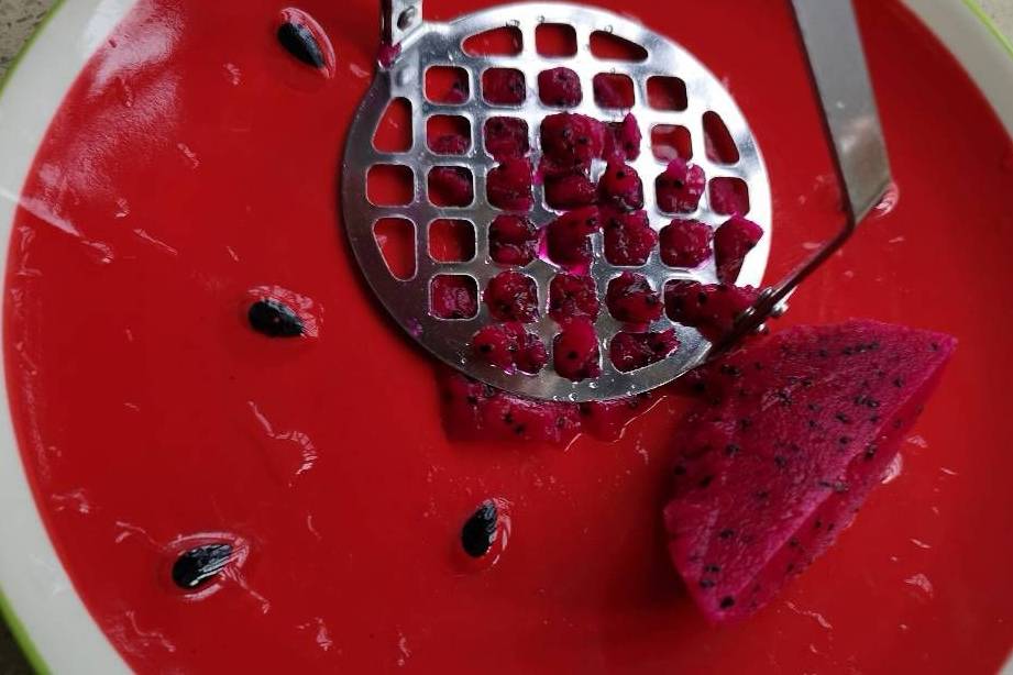 3、火龍果放盤子裡,搗碎