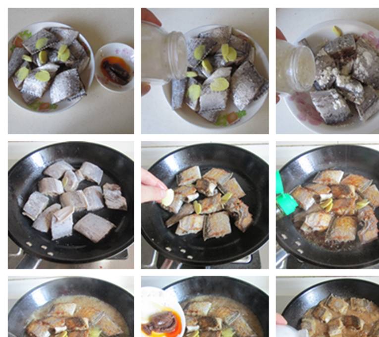 制作:1.準備好原材料;2.帶魚塊放入適量的鹽、高度白酒和薑片,拌均勻醃制一下;3.入鍋前放入少許淀粉裹在帶魚表面;4.熱鍋涼油,放入帶魚塊進去煎;5.煎至帶魚雙面金黃後加入薑片進去煎一下;6.烹入適量的高度白酒和生抽;7.加入適量的水;8.加入沙茶醬,大火煮上三分鐘;8.加入適量的鹽,註意中間要翻動一下,大火收汁即可;