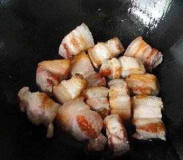 記得把五花肉買回來後要用冷水進行一次焯水,這樣才會讓肉質更加精致,吃起來更加有嚼勁,接著用刀切好大蒜,生薑放碗中備用,在鍋中放入少許的食用油,把焯水的五花肉切成小塊狀放到油鍋中煎至兩面金黃後,就可以發現鍋中的油量變多,這是因為在用中火煎至五花肉的時候,把裡面的肉油煎出來瞭,這樣肥肉就會減少很多油膩感。