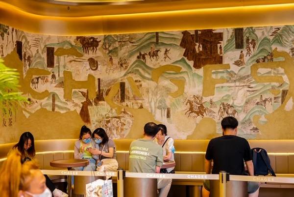 在上海旗艦店,霸王茶姬將標志性的"C"字品牌紋樣,升級為唐文化中標志性的釉彩風格。釉色光影裡,大唐悠遠的茶香,飄蕩進千年後的每一杯東方茶。在TEA BAR,與品牌紋樣交相呼應的,還有象征東西方文明交匯的“絲茶之路”繪墻。斑駁的繪畫從敦煌石窟文化中汲取靈感,看駝鈴悠悠,出陽關進西域,過樓蘭抵羅馬,東方茶從這裡走向世界,一部茶葉史,半部文明史。