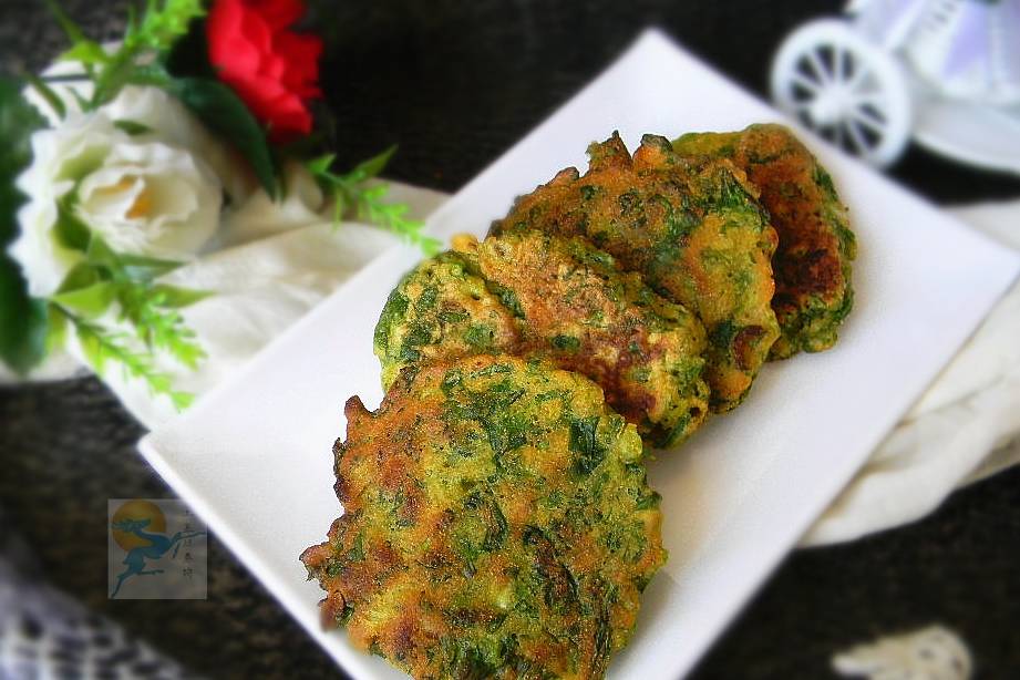材料:芹菜葉70克,玉米面50克,白面50克,雞蛋1個,鹽1/2小勺,小蘇打1/2小勺
