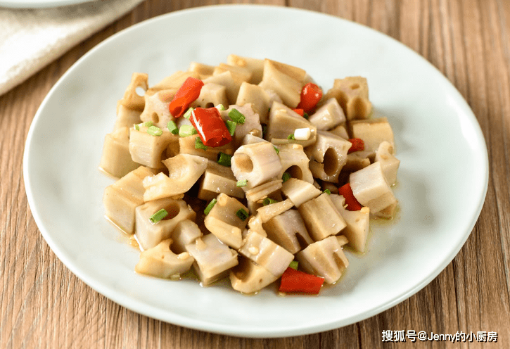 另起鍋加油,燒熱後放入薑蒜爆鍋,再倒入藕丁翻炒,繼續加入生抽、陳醋、白糖翻炒。