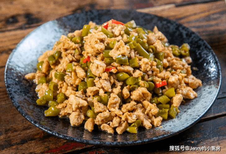 接著倒入酸豆角翻炒,炒個三五分鐘,將酸豆角炒熟,加入少許雞精,淋入少許清水翻炒均勻,就可以出鍋瞭。