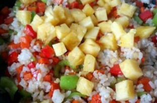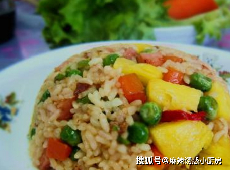 4、最後倒入菠蘿大火翻炒均勻,使得米粒充分吸收菠蘿的果甜味。