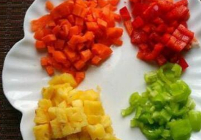 1、備料。胡蘿卜、青椒、紅椒分別洗凈切丁,菠蘿取果肉切丁。