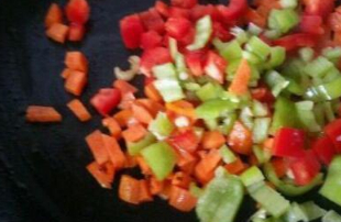 2、起鍋,熱油,放入少許蔥花煸香,隨後倒入胡蘿卜丁炒一下。蘿卜翻炒至軟化後,倒入青椒,紅椒,繼續翻炒。