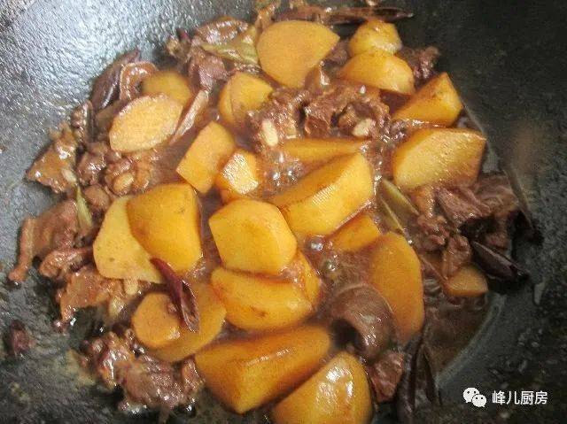 6、放入土豆塊燒熟,最後大火收汁,放鹽,雞精調味,收汁即可出鍋。