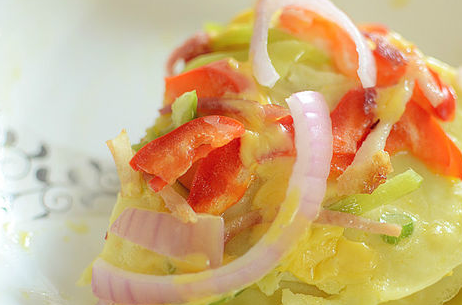 6、接著鋪上青紅椒絲、洋蔥絲