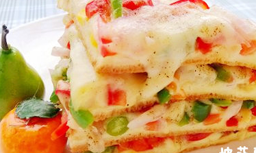 【食材】:雞蛋2個、培根一片、洋蔥1/4個、青椒1/2小個、紅椒1/2小個、早餐奶酪1片、面粉少許、香蔥一顆