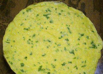 加入適量的油,再加入鹽,最後加入蔥花,卷起一頭,揉成一圈再搟成薄餅。然後在電熱鍋上刷一層油,把煎餅放入電熱鍋中,然後把雞蛋打入碗中。攪拌均勻後,將面餅刷上蛋液。將兩面煎至金黃色。