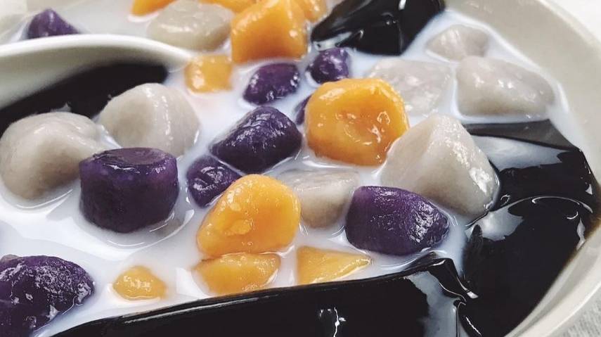6.芋圓燒仙草。芋圓燒仙草是小編常吃的甜品啊,喜歡芋圓的彈牙,喜歡仙草的香滑,還有其他的配料,都喜歡。其中看似簡單的芋圓是由香芋、紫薯、紅薯、木薯粉等制作而成的,怪不得那麼好吃。