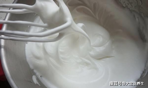 5、然後將蛋白部分加入白糖中,但是白糖一定要分三次加入。每次攪拌均勻,直至達到如圖所示狀態。現在將1/3的蛋白酥皮加入蛋黃混合物中並充分混合。