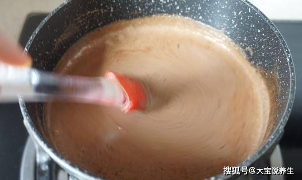 2.煮沸後,將奶鍋從火上移開。過篩的巧克力醬會更好吃。輕輕攪拌直到巧克力醬冷卻。