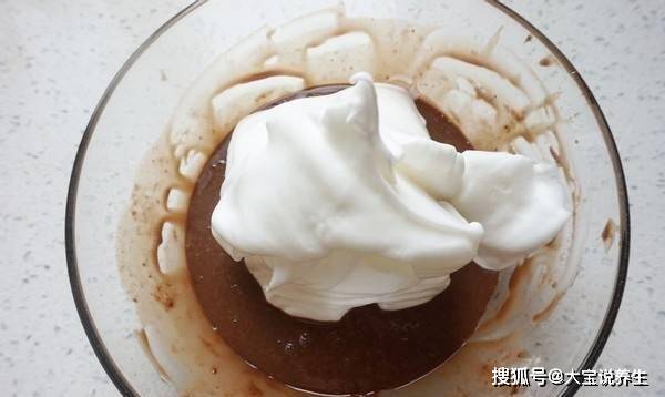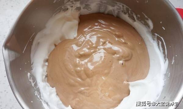 6、接下來將蛋黃塊中的所有材料倒入剛剛做好的蛋白霜中,用小抹刀攪拌均勻。