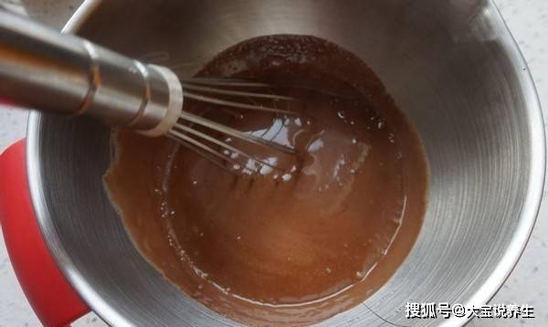 4.然後我們就完成蛋糕片的部分瞭。牛奶中加入少許玉米油,用攪拌機攪拌成酸奶。將低筋面粉和可可粉篩入牛奶混合物中,然後加入蛋黃繼續攪拌均勻。