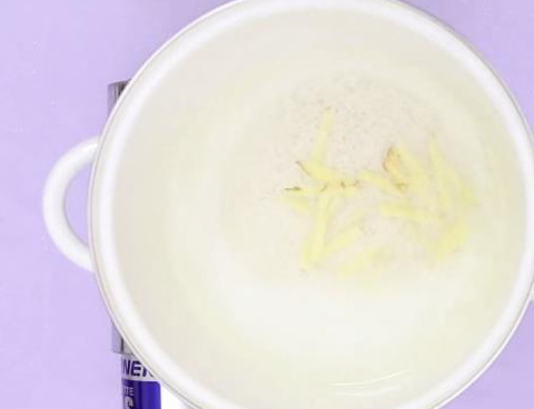 3、取鍋加入適量清水,倒入泡好的糙米,加入薑絲,蓋上鍋蓋。