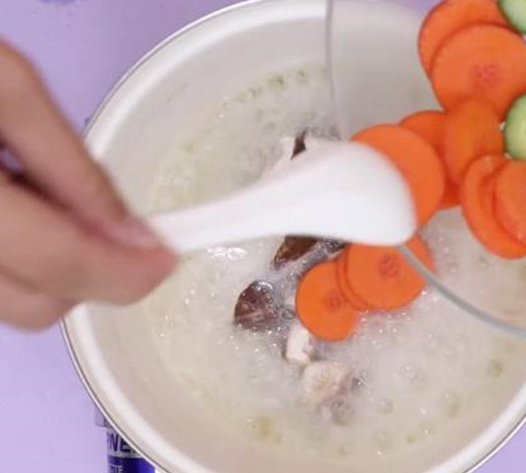 4、鍋內清水沸騰後加入香菇、胡蘿卜和黃瓜。