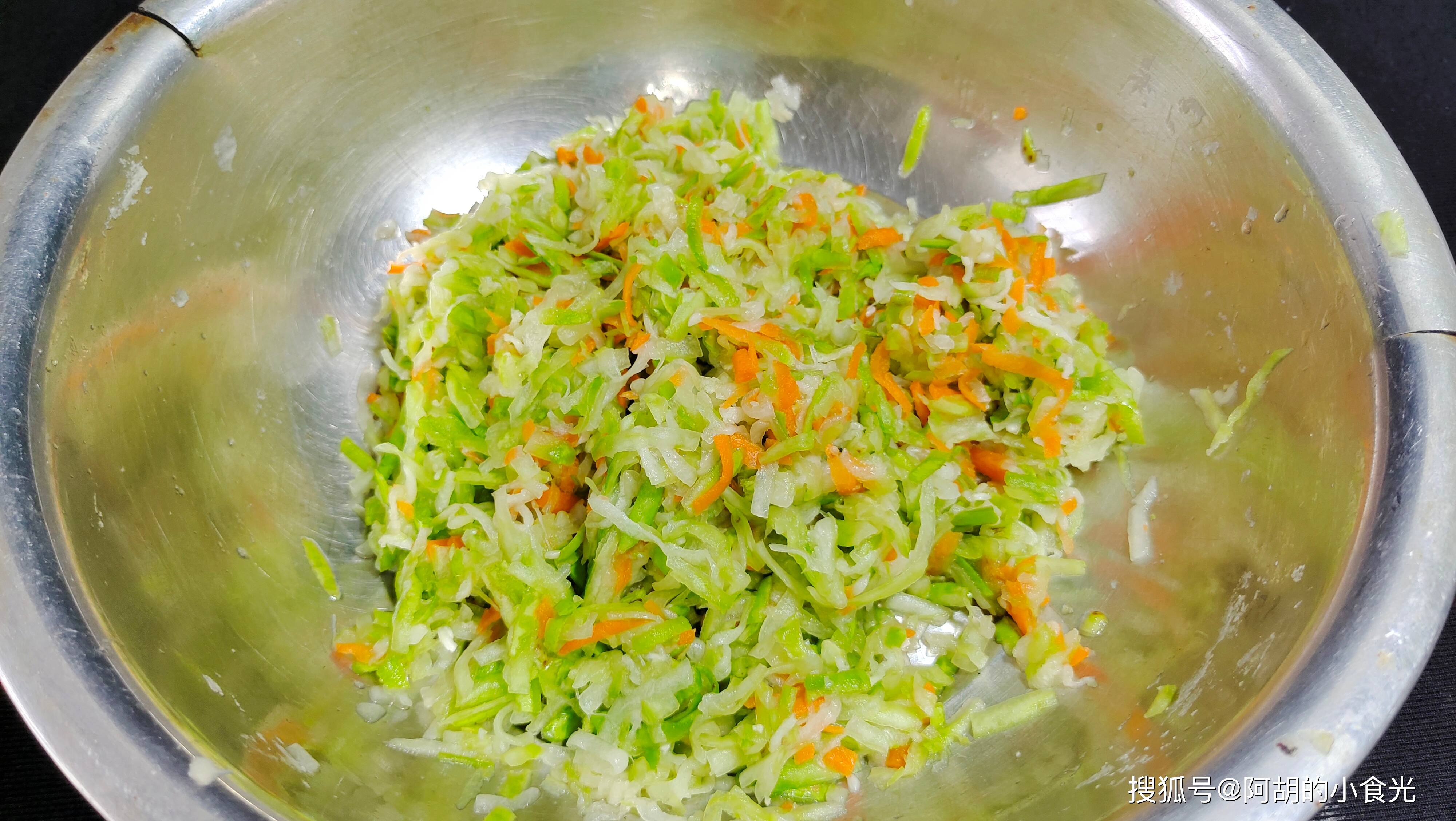 第一步:瓠子洗幹凈後直接用擦絲工具擦成細絲,註意此處的瓠子皮可以去也可以不去,可以用手掐一掐,比較鮮嫩的留著食用也不錯。再擦一點胡蘿卜絲進去配色,撒入一把食鹽醃制10分鐘左右去水,最後擠幹水分備用。