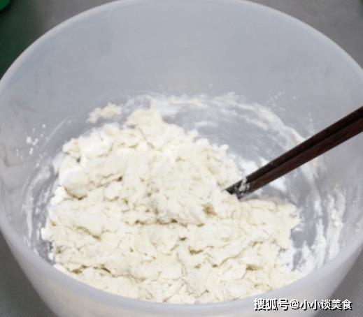 3、然後在面粉中加入適量的植物油,拌勻成光滑的面團,蓋上保鮮膜靜置20分鐘左右。