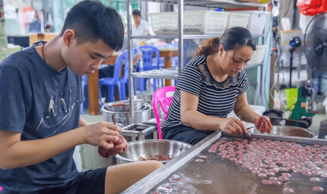 對於丸子的制作工序,客傢人娓娓道來,瘦豬肉(或魚、雞、鴨、牛肉)和番薯粉都是制成客傢肉丸的主要原料。