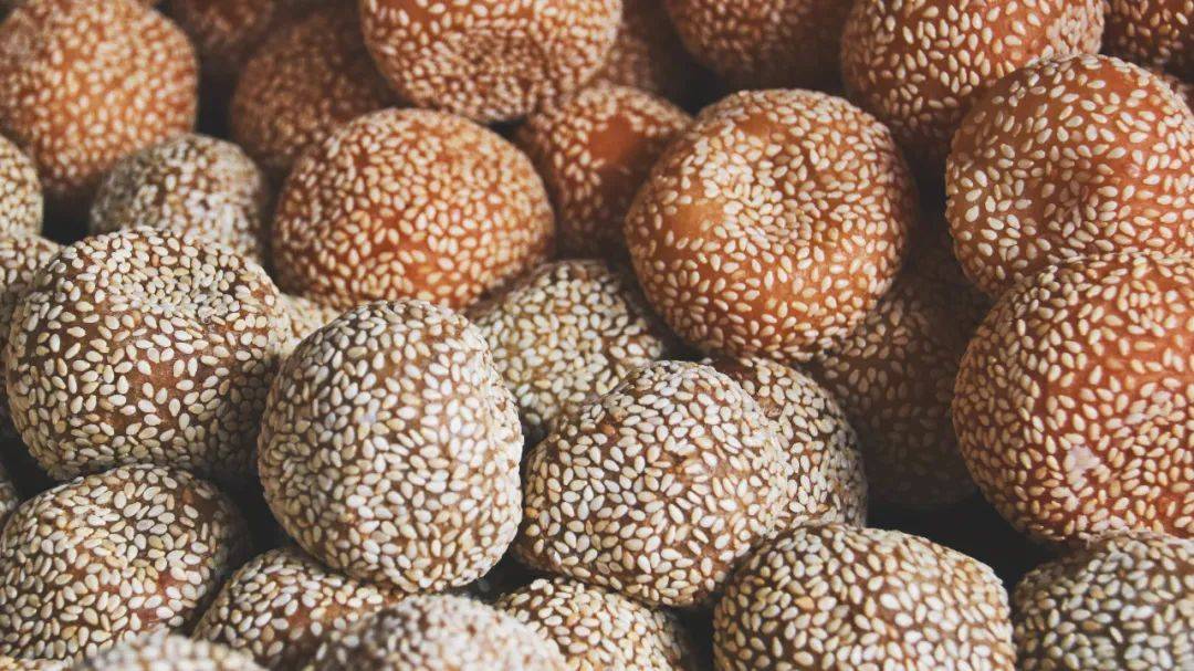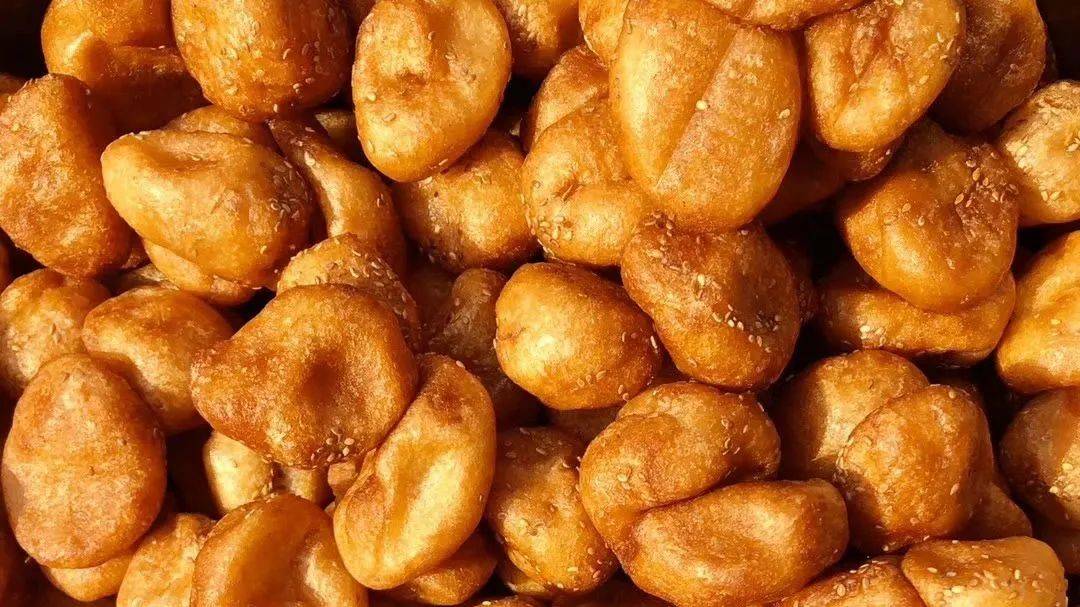 煎圓又叫煎堆,是用糯米粉加糖、芝麻等,放到鍋裡用油煎成。色澤金黃,外形渾圓中空,口感芳香酥脆,體積膨大滾圓,表皮薄脆清香,內裡柔軟粘連,又香甜可口。有團圓、甜蜜的寓意。