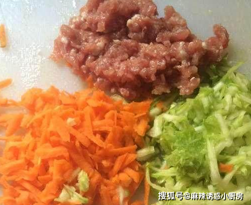 胡蘿卜西葫蘆擦絲,肉末加少許鹽和料酒準備