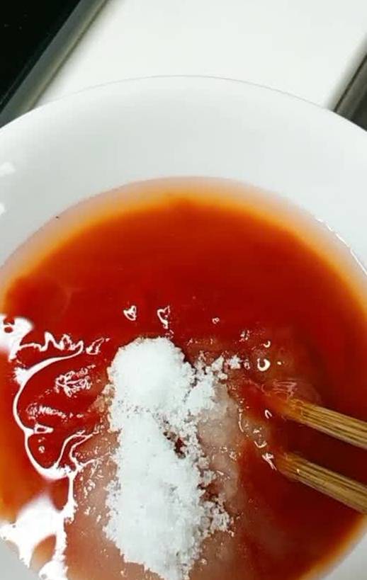 4、碗中裝入2勺的番茄醬(昨天剛好自制的一鍋,今天就可以排上用場啦),再來1勺的白糖和米醋,調成濃稠的酸甜汁。