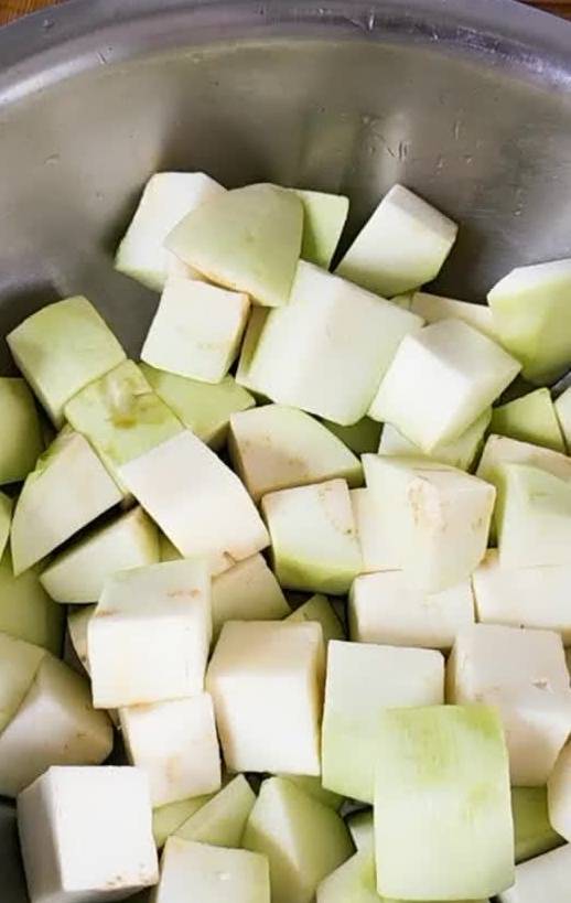 1、首先挑選個新鮮的圓茄子,去皮後切成小方塊,再用涼水沖洗幹凈,再將它瀝幹水分裝入碗中備用。