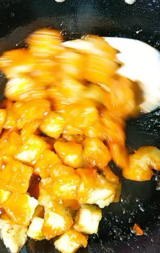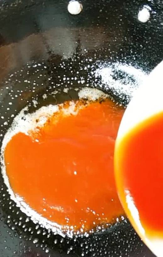 5、鍋中放入少許的油,燒熱後將調好的酸甜汁,倒入鍋內開小火將它熬制更為濃稠的醬汁,再加入炸好的茄子,顛炒均勻即可出鍋,酸甜酥脆爽口,孩子超級的喜歡吃!