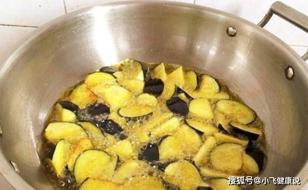 咸茄子撈出水,蘸一層淀粉,最好是玉米淀粉,下鍋煎至茄子呈金黃色撈出控油。