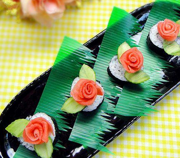 9.把蘿卜邊卷邊往外翻卷成玫瑰和葉子放在壽司上即可。