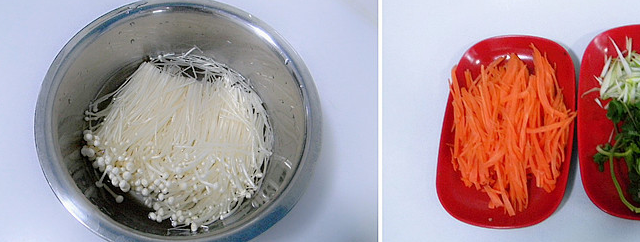 1、金針菇去根部,洗幹凈;胡蘿卜切絲,蔥切絲,香菜隨意切斷。