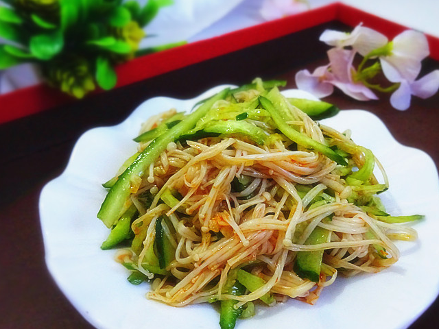 材料:黃瓜200克,金針菇100克,糖1勺,醋2勺,鹽適量,紅油適量,大蒜半頭