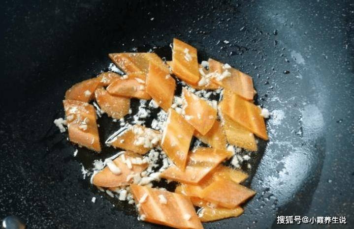 準備步驟4:將鍋加熱至50%的熱量,加入切碎的大蒜和一些生薑炒,先加入一些胡蘿卜,攪拌至胡蘿卜變色。