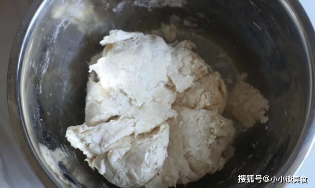 4、發酵好的面團用適量的幹粉揉幾次,因為發酵後面團會比較粗糙。想要最終的成品口感好,就需要經過這個揉捏的過程。正確的狀態是面粉逐漸混入面團中,面團也開始變得細膩,最後呈光亮細膩的狀態非常好,如圖