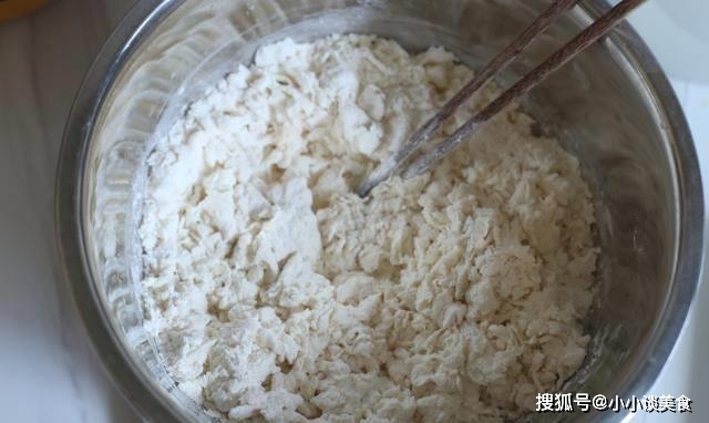 1、將配方的所有材料放入料理容器中,用筷子攪拌成薄片狀。有瞭這一步,我們可以減少揉面時面團的粘性,也可以大致判斷此刻液體的用量是否合適。