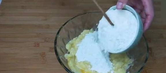 接著準備一碗面粉分次少量的加入到土豆泥中,由於土豆的大小不一樣面粉要適量的增減。