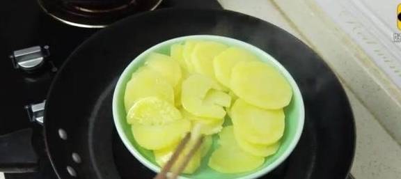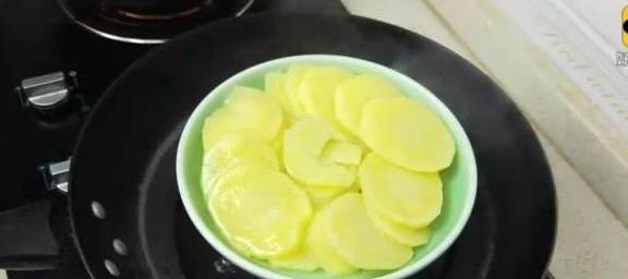 把切好的土豆片全部裝在盤子裡上鍋大火蒸20分鐘。