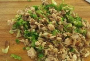 做餅,餅做好後,把肉剁碎,放入切好的青椒,青椒切的小一點,把肉汁倒上去一點,加入餅中,好啦,可以開動啦!