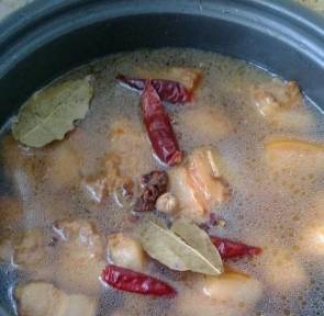 把肉肉倒進電飯鍋裡,倒入水、薑、鹽、大料、花椒、料酒燉兩個小時。