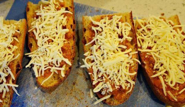 小烤箱烤到起司融化有點變金黃色就好,外殼酥脆,面包心柔軟,番茄肉醬搭配牽絲的起司很好吃