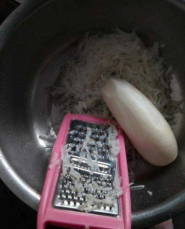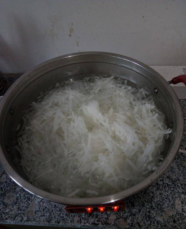 做法:1、準備好需要用到的全部東西,白蘿卜洗幹凈以後,刮掉外面的皮,再把它擦成絲,鍋裡面加入水,把蘿卜絲放到裡面煮開瞭以後,撈出放到涼水中冰一下